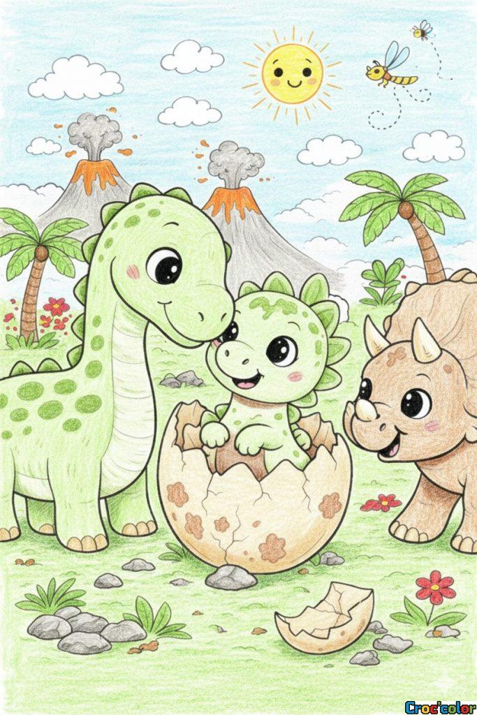 - Le Nouveau-Né : Au centre, un tout petit dinosaure sort tout juste de son œuf étoilé. Sa bouille craquante est la pièce maîtresse du dessin.