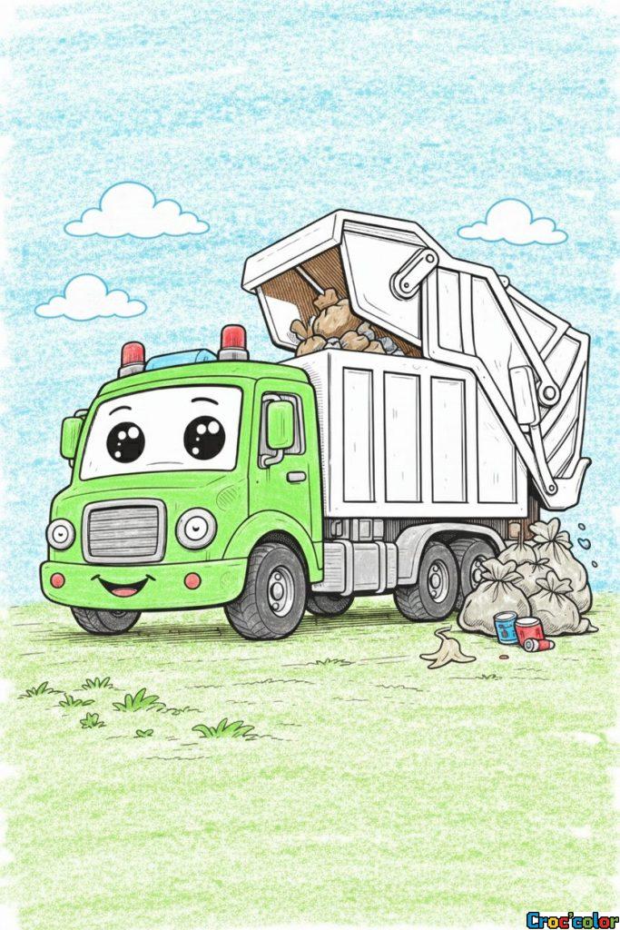- Mots-clés : coloriage camion poubelle à imprimer, dessin recyclage enfant gratuit, coloriage véhicule ville kawaii, activité écologie maternelle, dessin camion de voirie souriant.