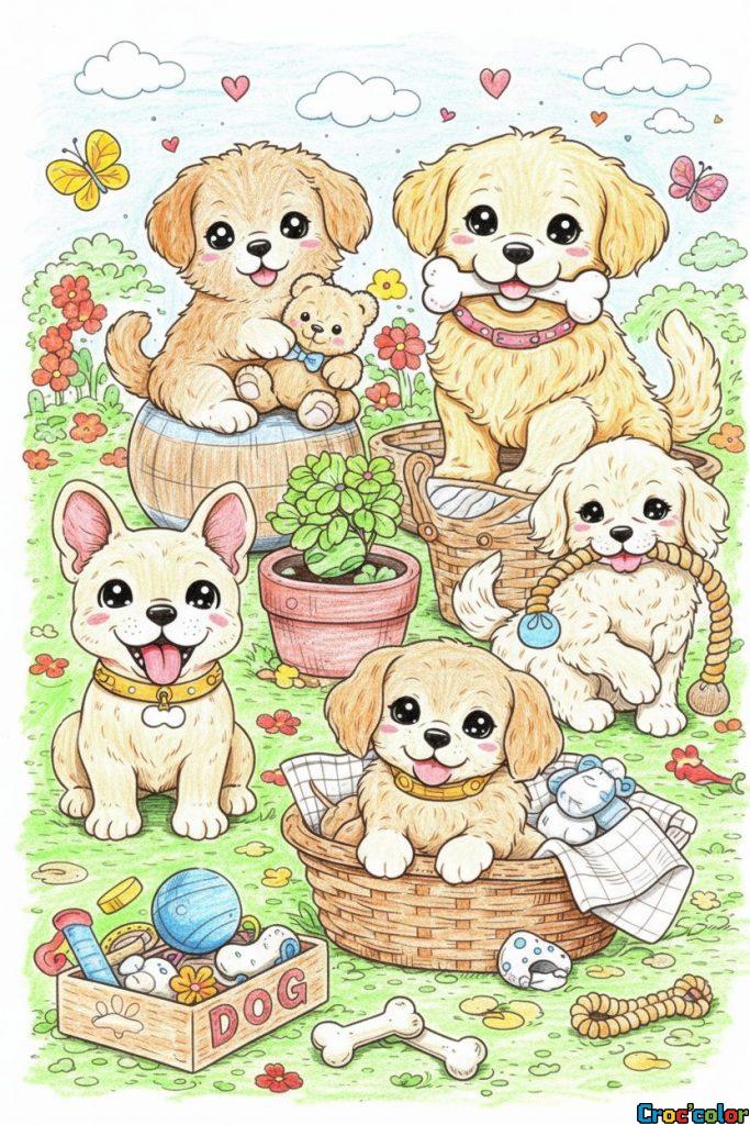 Craquez pour ce magnifique coloriage de famille de chiots gratuit. Ce dessin ultra-détaillé met en scène cinq petits chiens malicieux s’amusant dans un jardin fleuri avec tous leurs jouets préférés. Entre les paniers en osier, les peluches et les ballons, cette illustration est l’activité idéale pour les enfants passionnés par les animaux et les univers « Kawaii » remplis de tendresse.