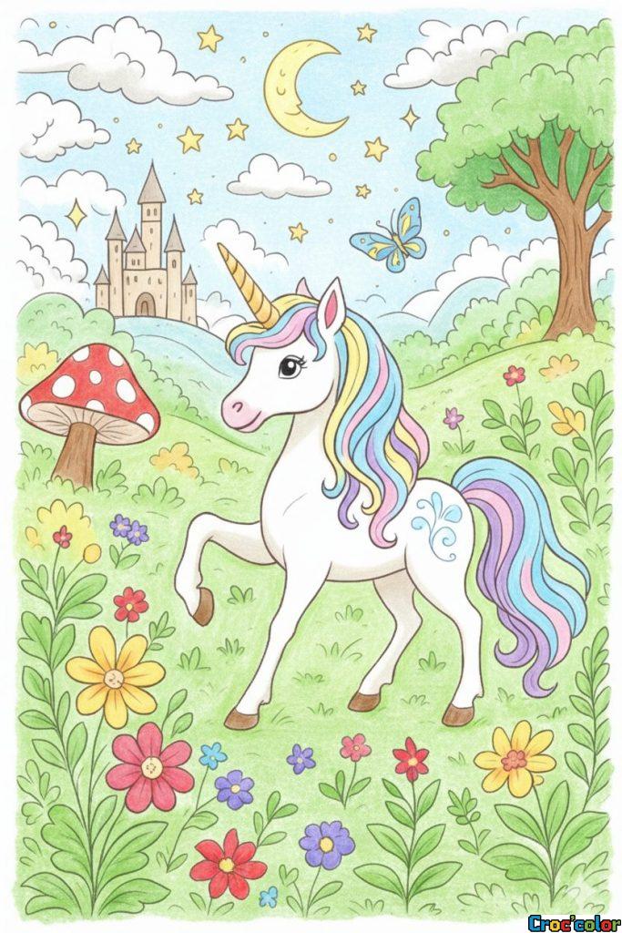 Éveillez l’imaginaire de vos enfants avec ce magnifique coloriage de licorne gratuit. Ce dessin féerique représente une licorne gracieuse se promenant dans une prairie enchantée, sous un ciel nocturne étoilé. C’est l’activité créative idéale pour les fans de créatures légendaires, de paillettes et de contes de fées.