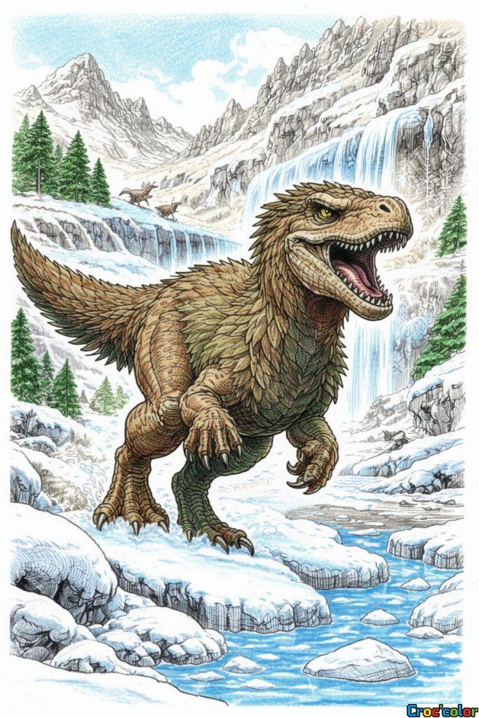 Coloriage T-Rex à Plumes : Le Prédateur Préhistorique dans un Paysage de Glace